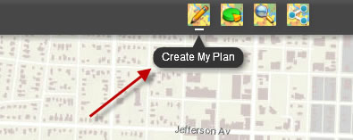 Along the top menu bar, click the Create My Plan button. This reveals a panel of features that can be drawn on the map, as well as a field to enter a plan name and your e-mail address. Your e-mail address will serve as your identifier in the design collaboration process.