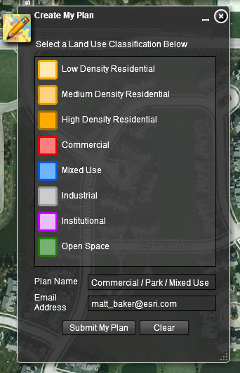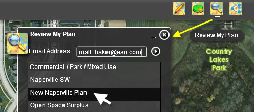 Step 7: Your plan is stored in a database, and since your e-mail address serves as your identification, you can retrieve any plan you've submitted by entering your e-mail address. Clicking the name of one of your saved plans will add it to the map. You can edit it, add features, and otherwise review multiple scenarios.