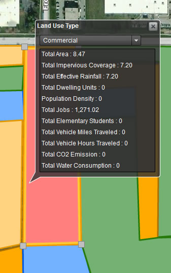 Planners know from researching existing plans that environmental, economic, social, and other indicators can be measured based on the area of a particular feature. With the use of Flex and a simple multiplication factor, a value for an indicator can immediately be calculated as a function of the area the feature represents on the map. For example, if an acre of commercial land use can generate 150 jobs, 4.5 acres will generate around 686 jobs.
