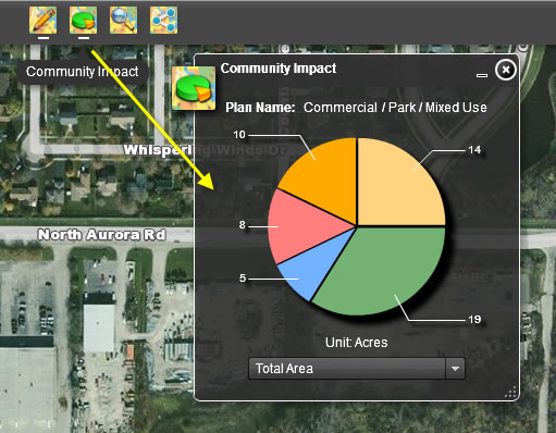 Step 4: Click the Community Impact button on the top menu to reveal a charting widget, which compares the areas of all the land-use types and each indicator, giving a visual measure of proportion to the land-use plan. This chart will also update as you draw more features, giving you live feedback on the quality of your design.