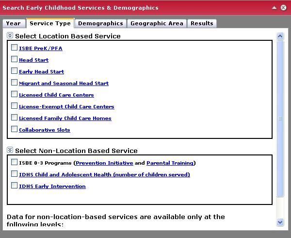 The Search Early Childhood Services and Demographics task allows users to choose from a variety of services, demographics, and geographic areas. This task is divided into five components. First, users choose the year of data they are interested in. Next, they choose the type of services available in that year. These are divided into location- and non-location-based services. The former are services (for example, Head Start) that are offered at an identifiable location that can be geocoded. The third component is demographic data. Users can select data related to population, several federal poverty levels, or language use. University of Illinois demographers calculated the 2005 demographic estimate data. The fourth component allows users to select from a variety of geographic areas. The last component shows the search results in a tabular format that users can export to a PDF or Excel file.
