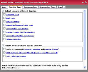 ![]() IECAM's Search Early Childhood Services and Demographics Tool allows users to select from a variety of early childhood services, demographics, and geographic areas. |