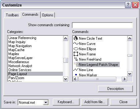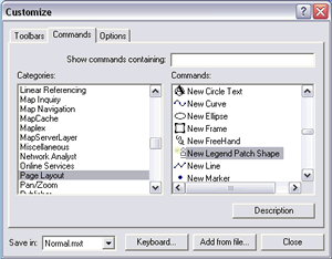 To use the New Legend Patch Shape button, use the tools on the Draw toolbar to create a graphic in the shape desired for the legend patch. Select it with the Element tool. Click the New Legend Patch Shape button. In the New Legend Patch Shape dialog box, uncheck the Preserve Aspect Ratio box and click Add to Stylesheet. Choose a name for the patch and click OK. This legend patch shape will now be available from the Style Manager.