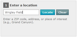 Step 1: Enter the location you want shown on your map and click the Locate button. You can enter a full street address (1600 Pennsylvania Ave, Washington, D.C.), a ZIP Code (90210), a city name (New York City), a famous landmark (Lincoln Memorial), or even a famous building (Sears Tower).