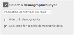 Step 2: Choose the demographics layer you'd like to see on the map from the drop-down menu, or check the Hide U.S. demographics box if you want to make just a locator map. When you show a demographics layer, you can also check the Click map for specific demographic data box if you want the map to show information about the population and demographics layer selected when people you share the map with click it.