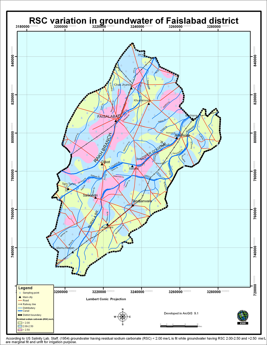 For the study, 210 groundwater samples were collected from farmers' tube wells and mapped using a GPS. Then these samples were analyzed in a laboratory to get attribute data on groundwater quality indicators such as electrical conductivity (EC), sodium adsorption ratio (SAR), and residual sodium carbonate (RSC). GIS layers of irrigation canals, roads, and railway lines, as well as main city and district boundaries, were digitized from topographic sheets with a scale of 1:50,000 using Esri's ArcGIS software. Contouring of attribute data was carried out using Surfer 8.00 software from Golden Software, Inc.