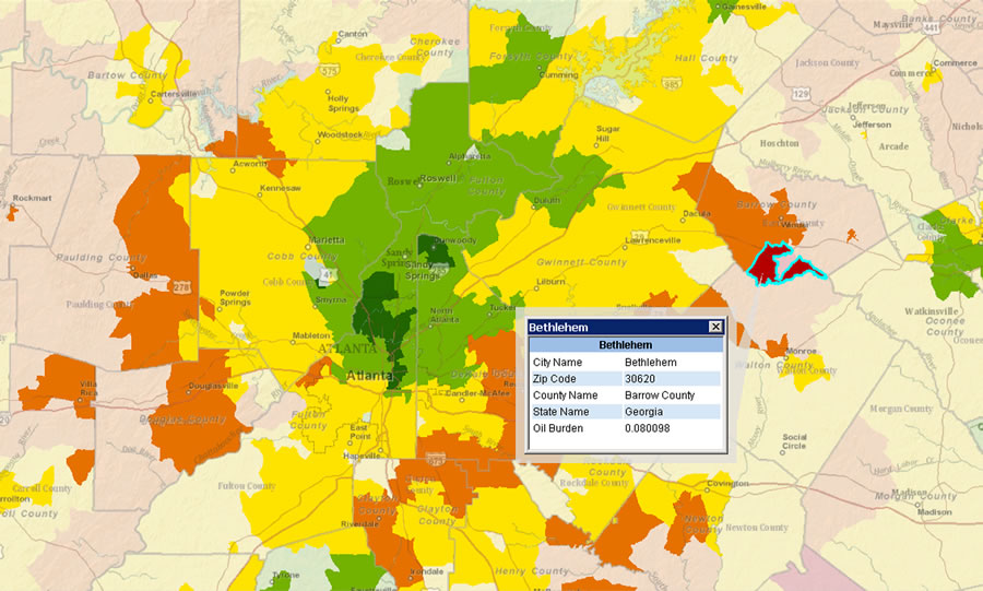Viewing the data with ArcGIS made complex data easier to understand. Basic thematic mapping brought the information to life—pockets of red can easily be seen, even in regions where a majority of commuters are not feeling a hardship from the rise in gas prices. One interesting example is Atlanta, Georgia. The center of the city is green, while the outskirts are red. This could be because those living in the city center can easily hop on the public transportation system, the Metropolitan Atlanta Rapid Transit Authority (MARTA). Those living in the suburbs don't have such an easy option.