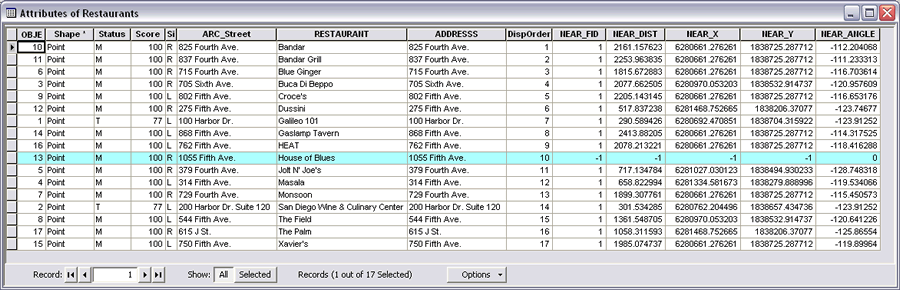 Locate the Near tool in the Proximity toolset of the Analysis tools in ArcToolbox (available at the ArcInfo license level). The accompanying illustrations show the Near tool used to generate distances from the San Diego Convention Center (where the Esri International User Conference was held August 4-8, 2008) to restaurants that are located within a half mile. After opening the Near tool, the Restaurants layer was added as the Input feature, the San Diego Convention Center layer was added as the Near feature, and the Location and Angle boxes were checked. Both layers were feature classes, but shapefiles also could have been used. The House of Blues restaurant was located outside the search radius of 2,500 feet so the analysis returned a value of -1 for the NEAR_FID, NEAR_DIST, NEAR_X, and NEAR_Y fields and 0 for the NEAR_ANGLE field. If the Input features layer contained selected features, the Near tool would have used only the selected features and set nonselected features to -1.