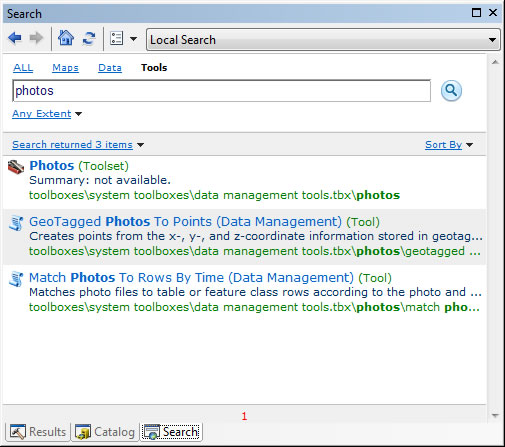 In ArcMap, locate the GeoTagged Photos To Points tool in the Photos toolset in ArcToolbox. Hint: Use the Search window and use the keyword "photos" or "geotagged" to easily find the toolset.