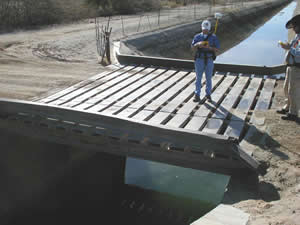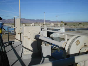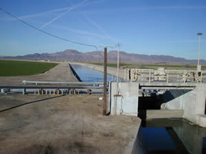 ![]() Water flow at the Colorado River Irrigation Project in Arizona is controlled by head gates on main laterals, servicing farmland from the main irrigation channel. |