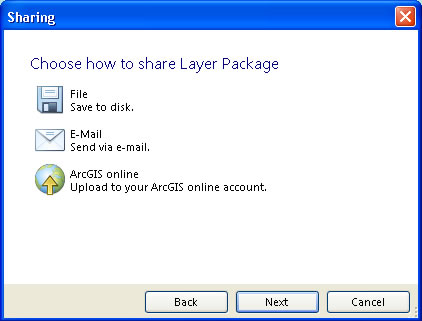 Step 3: Choose a sharing format: an ArcGIS Explorer map content (.nmc) file, a layer package (.lpk) file, or a KML file. In this case, choose a Layer Package.