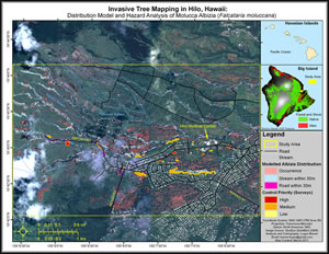 After developing a map showing the regional distribution of Molucca Albizia, he used the software to identify areas where the trees grew within 100 feet (~30 m) of a road or stream. Trees within the 100-foot buffer zone were of particular concern, as they could fall during a windstorm and block roads or clog streams and cause flooding. Berner overlaid the results from the roadside survey, the distribution model, and the hazard analysis on the QuickBird satellite imagery. To place the neighborhood and regional distribution of this invasive tree into the broader context of invasive species on Hawaii, he added a small inset map showing the islandwide distribution of native and alien forest and shrub ecosystems, previously mapped by the Hawaii Gap Analysis Program.