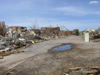 ![]() A once-prosperous downtown street in Greensburg was left with rubble and twisted trees by the EF5 tornado. (Image courtesy of Larry Reynolds, Kansas PVD) |