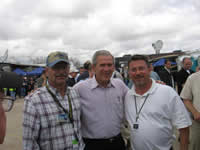 ![]() President George Bush visited Greensburg on Wednesday, May 9, 2007, and took time for a photo with two KAM members, D. J. McMurry (left) and Bruce Hardesty (right). McMurry and Hardesty were both instrumental in creating GIS maps after the tornado. (Image courtesy of Larry Reynolds, Kansas PVD) |