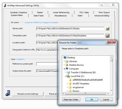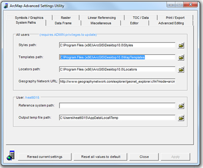 Step 1: Click twice on the ArcMapAdvancedSettings.exe located at C:\Program Files\ArcGIS\Desktop10.0\Utilities to run the utility application. It allows you to change the default location where the map templates are stored from the ArcGIS installation directory at C:\Program Files\ArcGIS\Desktop10.0\MapTemplates\ to a networked or shared location that your whole team can access.