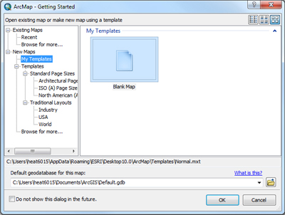 Step 3: Create a new template by opening ArcMap. First, create a new blank map by selecting New Maps > My Templates > Blank Map from the Getting Started or New Document dialog box. If needed, change the default geodatabase location to the workspace you most commonly use and click OK.