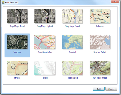 Step 5: This will open the Add Basemap window and allow you to choose from the dozen basemaps Esri offers including Bing Maps Aerial, Imagery, Streets, and Topographic. Choose Imagery and click the Add button within the window.
