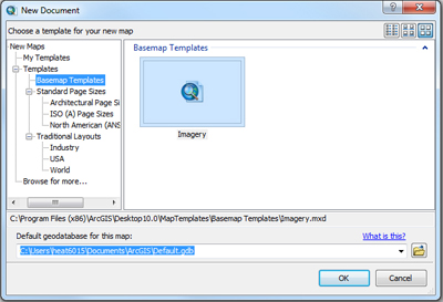 Step 7: Now you can quickly start a new map document with imagery as the basemap by opening a new document (File > New) and choosing the Imagery template document from the network location you just set.