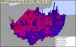 One pilot dataset is the Record of American Democracy (ROAD), collected by Harvard's Government Department (visit http://data.fas.harvard.edu/ROAD/). It includes election returns, socioeconomic summaries, and demographic measures of the American public at unusually low levels of geographic aggregation. A geographic unit called the Minor Civil Division (MCD)-Group was created to permit analysis of precinct-level election data with census data. The center's staff developed a tool that allows users to select a subset from the roughly 3,500 electoral and census variables in the ROAD dataset and append them to a shapefile of MCD-Group boundaries. The resulting shapefiles allow researchers to analyze spatial patterns and correlates of voting behavior. Maps could then be made that relate U.S. Census data to election returns at the precinct level, giving scholars and other researchers a better picture of how people voted based on factors such as income, occupation, and ethnicity. They can then study voting patterns based on demographics and geography.