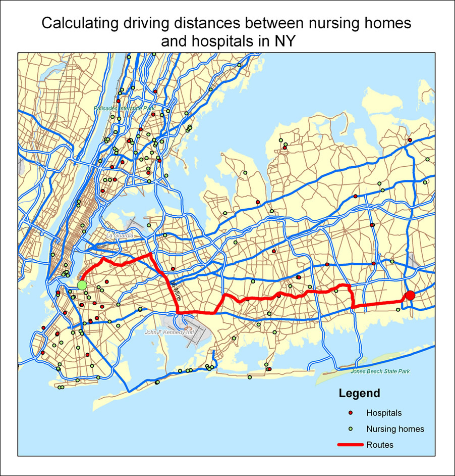 Although a variety of variables may be associated with nursing home residents being hospitalized, one that will be analyzed is the geographic distance between nursing homes and hospitals. This project uses Esri's ArcGIS Network Analyst and free data from ArcGIS Desktop's StreetMap USA to calculate the driving distances between nursing homes and hospitals. These distances will be analyzed, along with data from the centers of Medicaid and Medicare services and New York state, to determine if there is an association between these distances and hospitalization of nursing home residents.