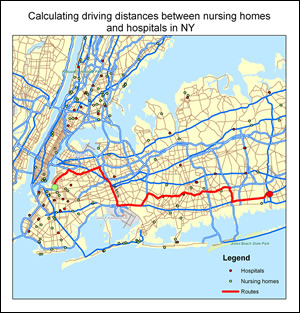 The Center for Geographic Analysis at Harvard University used Esri's ArcGIS Network Analyst and Streetmap USA product to calculate the driving distances between pairs of nursing homes and hospitals in New York state. |