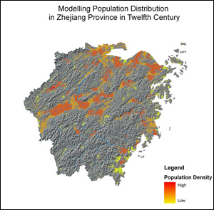 Staff at the Center for Geographic Analysis at Harvard University created this map that showed, hypothetically, the areas of high and low population density in Zhejiang province, China, in 1102. |