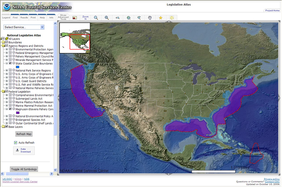 ![]() The Legislative Atlas searchable Federal Data Viewer returns State Coastal Zone Boundaries and their spatial relation to the Magnuson-Stevens Fishery Conservation Act. |