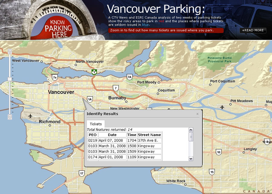 In downtown Vancouver, British Columbia, Canada, this happens regularly to people just trying to squeeze in some shopping in the late afternoon. Canadian television network CTV recently used GIS to help investigate the distribution of parking enforcement in the bustling Canadian metropolis in a series titled "Know Parking Here." The first part of the series used GIS to analyze citation data from Vancouver's popular residential and retail districts. Read the CTV story.