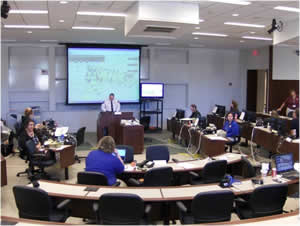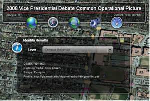 Within two weeks of receiving funding for the project, the 2008 Vice Presidential Debate Common Operational Picture was complete and ready to go. Using the application meant the university could provide the necessary maps on the day of the event, but not in the traditional way. "We were worried about past debates where we would print 60 or 70 maps on the event day but, between delays and changes, they weren't very useful for security," explained Addison.