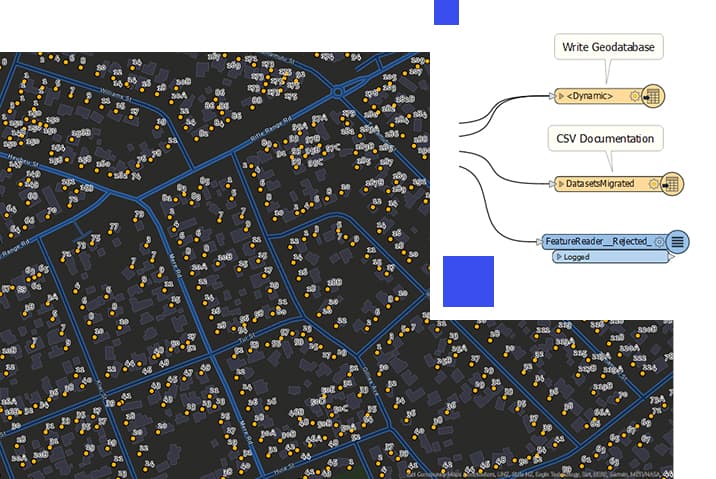 Rozszerzenie ArcGIS Data Interoperability dla aplikacji ArcGIS Pro i oprogramowania ArcGIS Enterprise zapewnia działanie wszystkich danych w procedurach wykonywania zadań na platformie ArcGIS. Użytkownicy mogą tworzyć własne narzędzia przy użyciu bezkodowego rozwiązania integracyjnego z wykorzystaniem mechanizmu Feature Manipulation Engine (FME) na platformie ArcGIS.