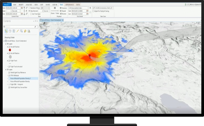 Wraz ze wzrostem natężenia ruchu lotniczego i rozszerzaniem się populacji wokół większości lotnisk wpływ hałasu będzie coraz większy. Ten stan wymaga narzędzi, które pomogą wizualizować, analizować i łagodzić wpływ hałasu na społeczności i środowisko naturalne. Technologia ArcGIS pozwala na zrozumienie dotkniętych problemem populacji, a także może być zintegrowana z informacjami o działkach w celu wsparcia planów pozyskiwania gruntów i łagodzenia skutków hałasu.